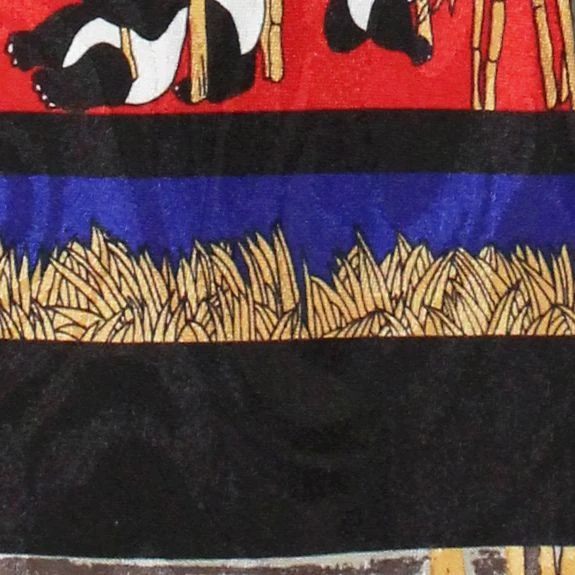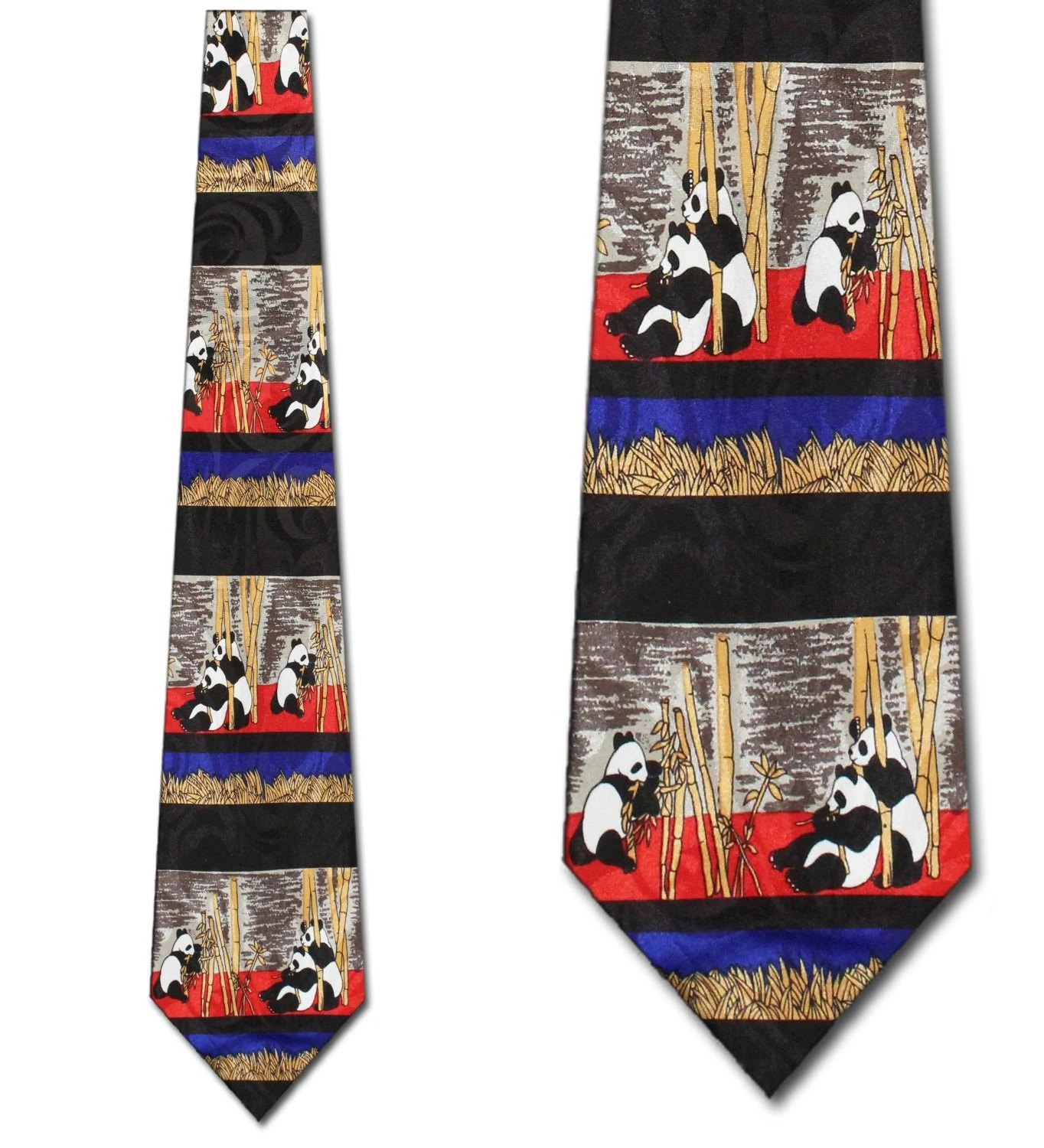 This animal themed tie features a repeat panel design of pandas surrounded by bamboo and a repeat black and red stripe design. Crafted in 100% polyester.