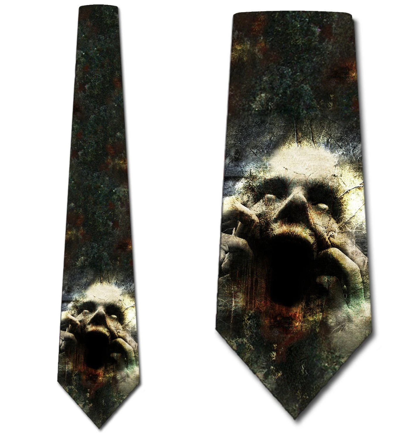 Trapped alone in the darkness, who knows what lurks around you? Driven crazy by the thought a man becomes unrecognizable as he morphs into a creature barely human. This scary face tie is crafted using 100 microfiber.